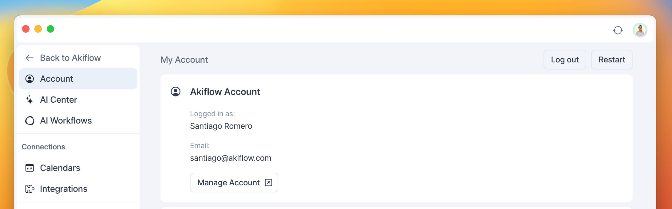 To manage your Akiflow account settings, go to Settings → Account → Manage Account. Here you can edit your account First and Last name and manage your account email.