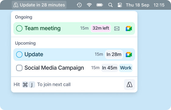 From the Menu Bar, you can take a quick glance at your ongoing and upcoming tasks, time slots (even tasks inside your time slots!) and events of the current day.