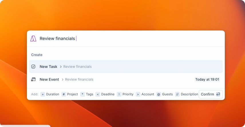 The Command Bar is the fastest way to create and edit tasks/events in Akiflow. Open it and instantly create, edit, or schedule tasks from anywhere on your laptop