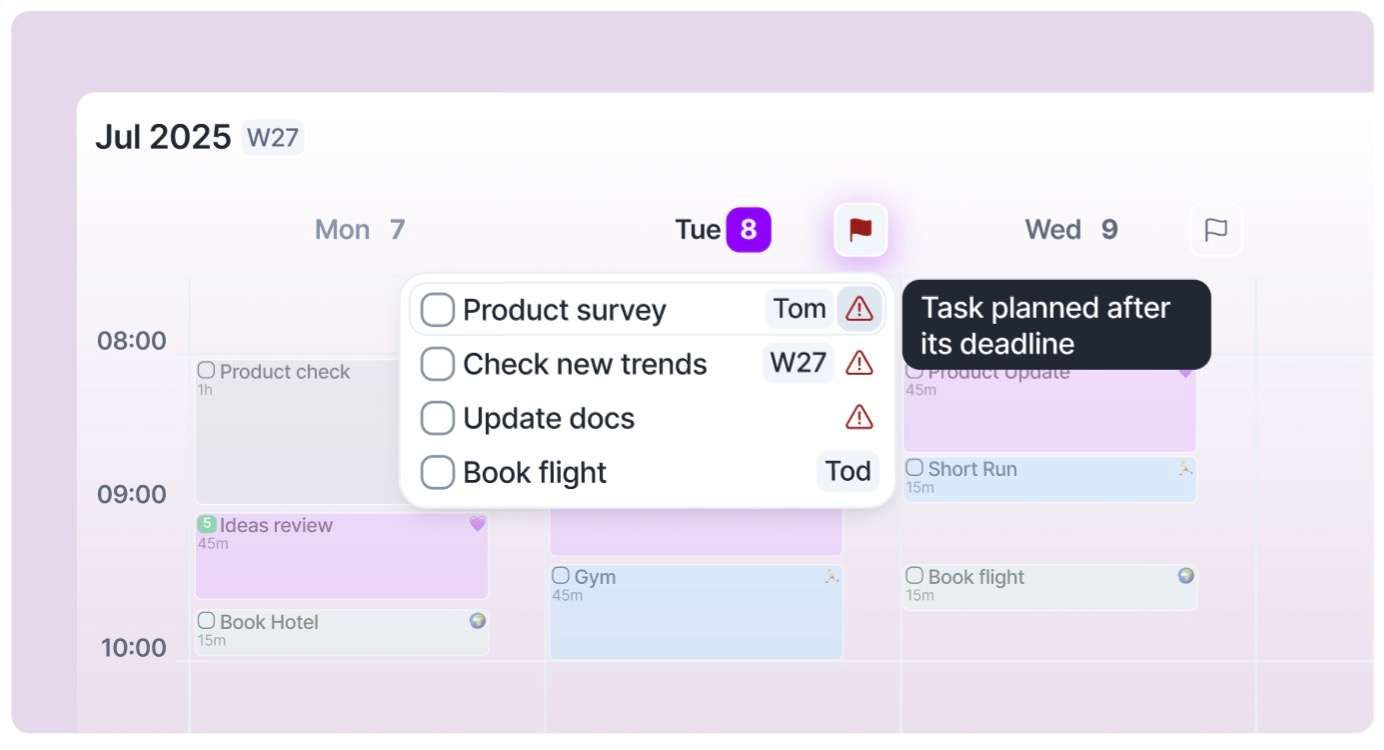 When you set a deadline, it instantly shows up in your calendar with a clear visual alert, so you can spot important tasks at a glance. You’ll also see a warning in your tasklist whenever something needs your attention.